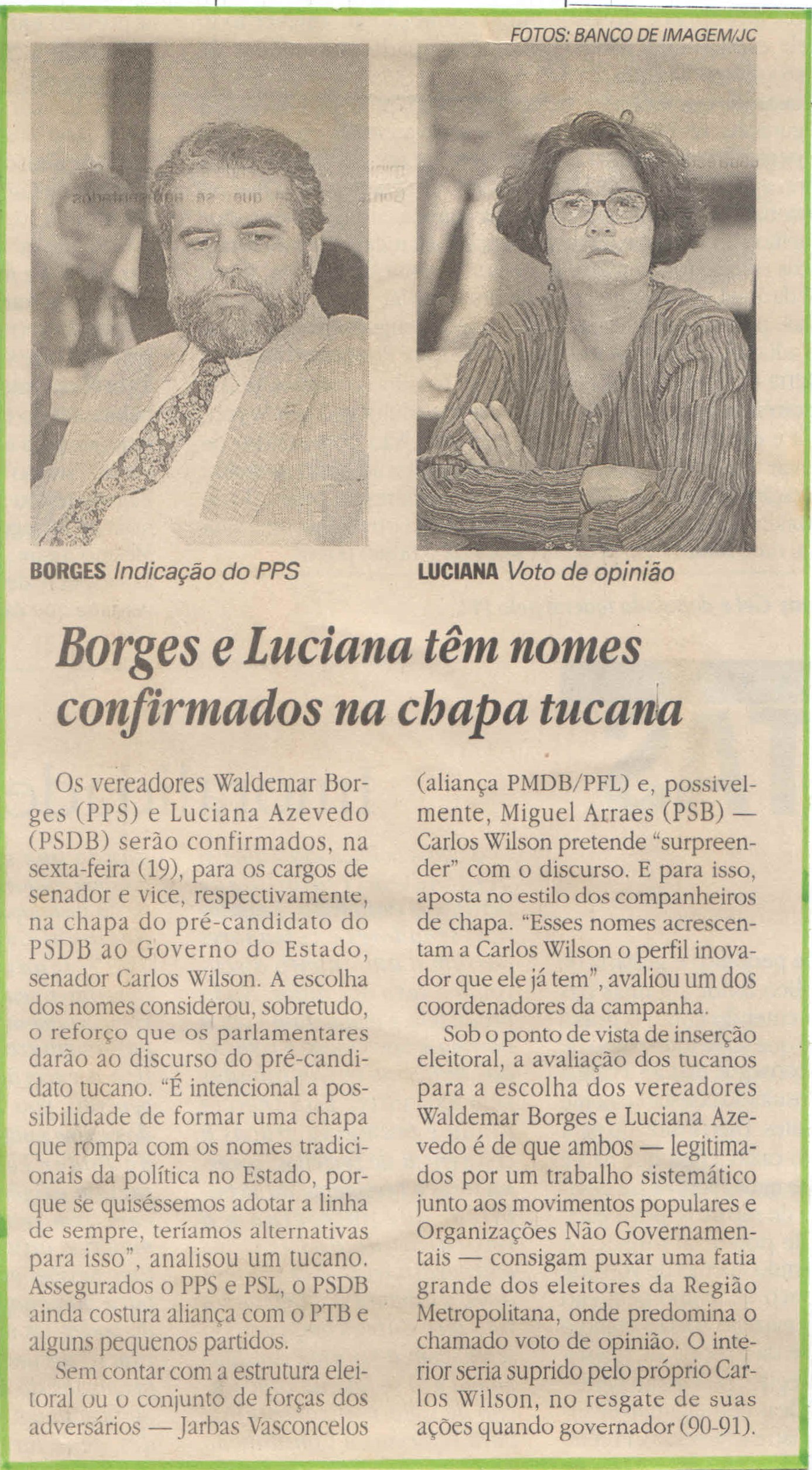 1998-06-17 – JC – Política – Borges e Luciana nomes confirmados na chapa tucana