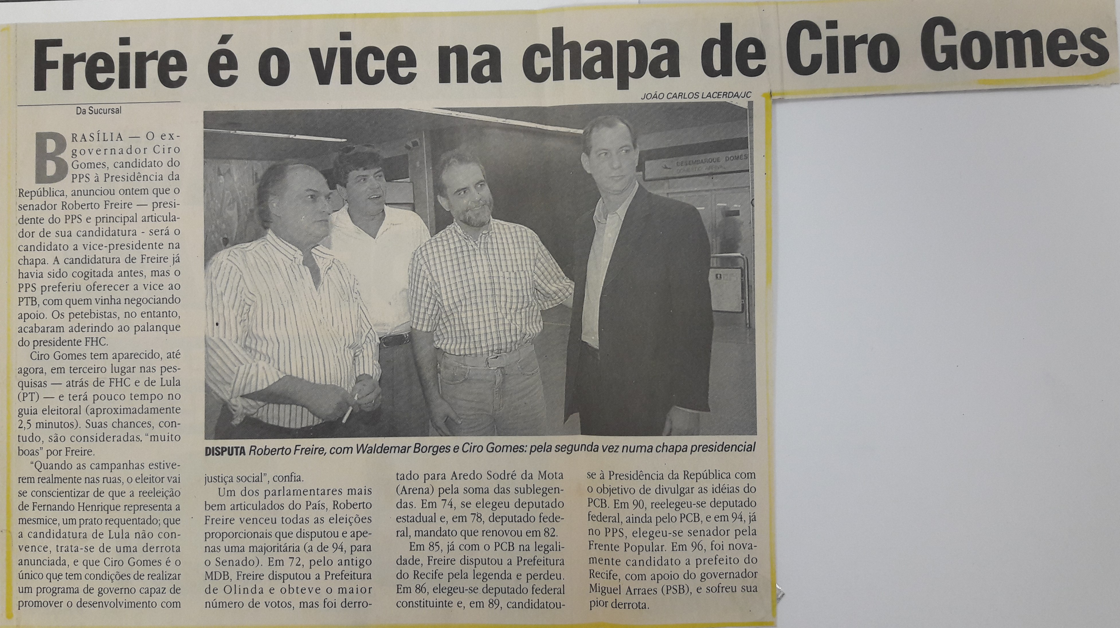 1998-07-02 – JC – Política – Freire é o vice na chapa de Ciro Gomes