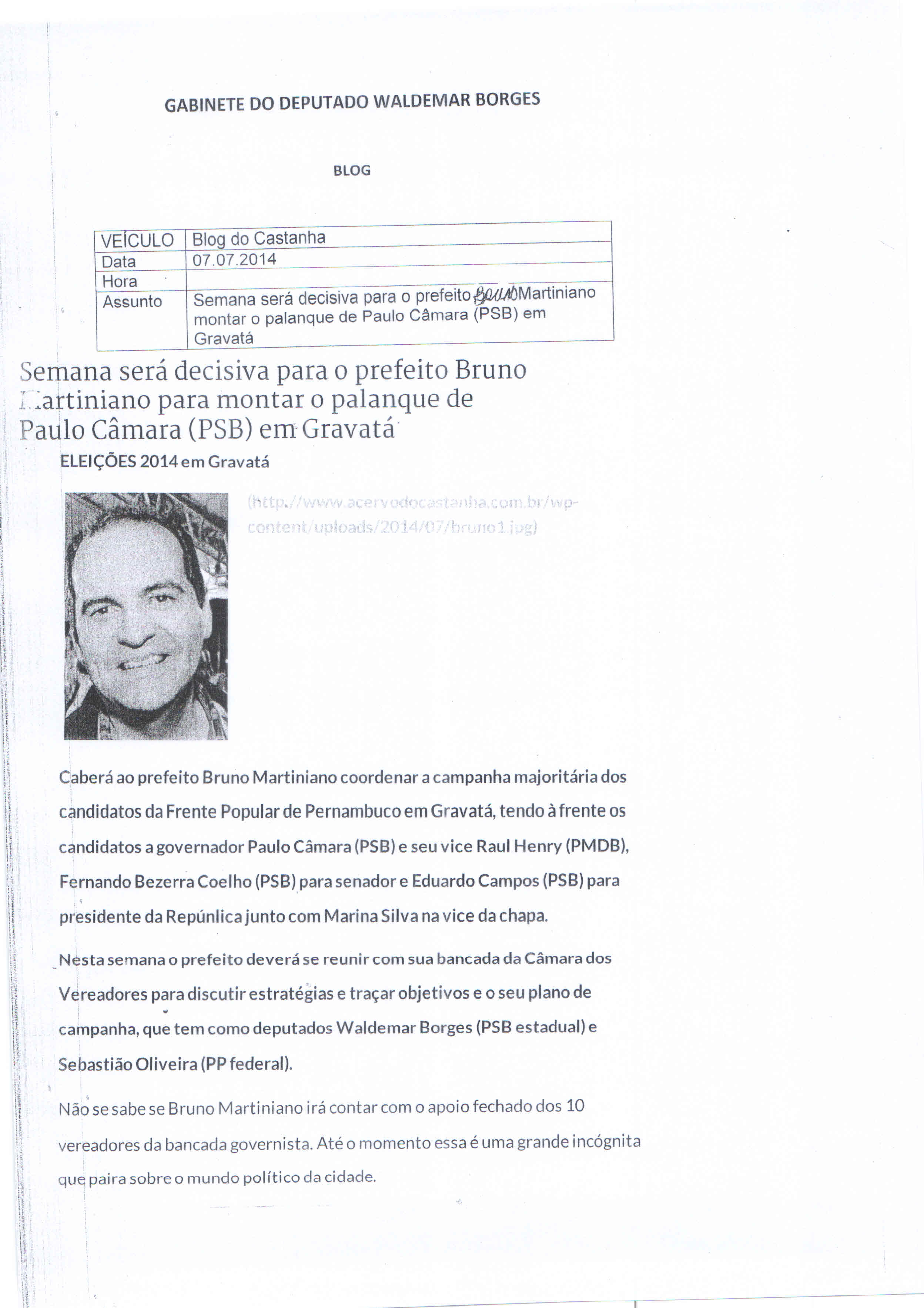07.07.2014 – Blog do Castanha – Semana será decisiva para o prefeito Bruno Martiniano para montar o palanque de Paulo Câmara (PSB) em Gravatá
